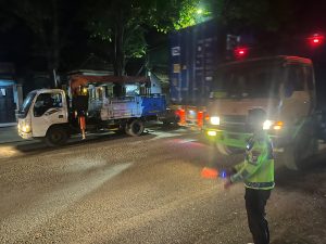 Guna memastikan kelancaran arus lalu lintas dan keamanan para pekerja di lapangan, Satlantas Polres Pasuruan menerjunkan personel dari Unit Turjawali. Kehadiran petugas sangat krusial mengingat volume kendaraan di jalur utama ini tetap tinggi meski di malam hari.