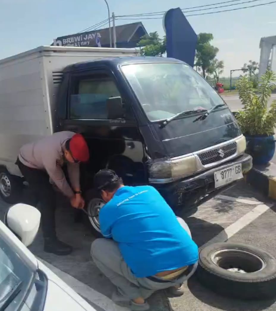 Petugas kepolisian dari Polres Pasuruan dengan sigap membantu permasalahan kendaraan para pemudik mulai dari pengecekan mesin hingga ganti ban yang kempes.